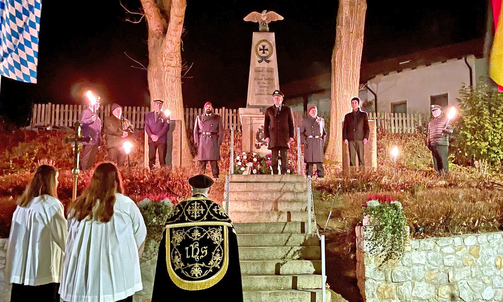 Im Vorfeld dazu waren die Vertreter der Soldaten- und Kriegerkameradschaft Dalking, die im nächsten Jahr auf 150-jährige Vereinsgeschichte blicken darf, fleißig, um das Denkmal an der Reisacher Straße herauszuputzen und für den Gedenktag zu schmücken. Zusammen mit dem Gemeinderat, Bürgermeister Daniel Paul und Altbürgermeister Karl Holmeier ging es mit den Vereinen und der Blaskapelle AuWe vom Gasthaus Meier hinunter zur Pfarrkirche Dalking, um die Heiligen Geheimnisse zu feiern. Organistin Hildegard Feiner hatte dazu passende Lieder herausgesucht. Auch Pfarrer Franz Merl brachte treffende Worte und Gedanken in seiner Predigt zu diesem wichtigen Gedenktag zum Ausdruck. Mit einem Trauermarsch und dem Kreuz an der Spitze ging es nach der Vorabendmesse hinauf zum Kriegerdenkmal, an dem der Priester mit Gebeten und Fürbitten das Mahnmal segnete und an die Toten und Gefallenen erinnerte.